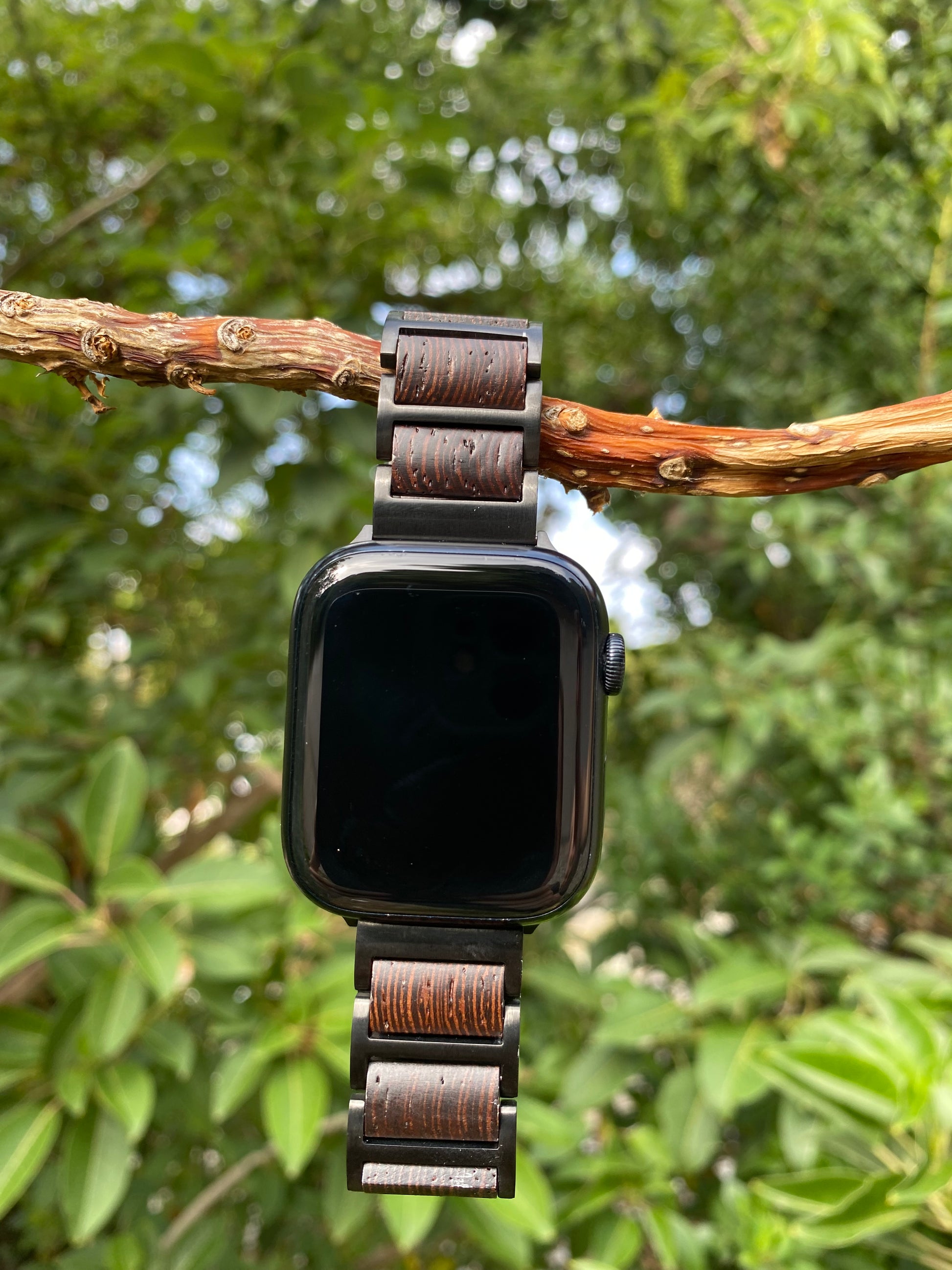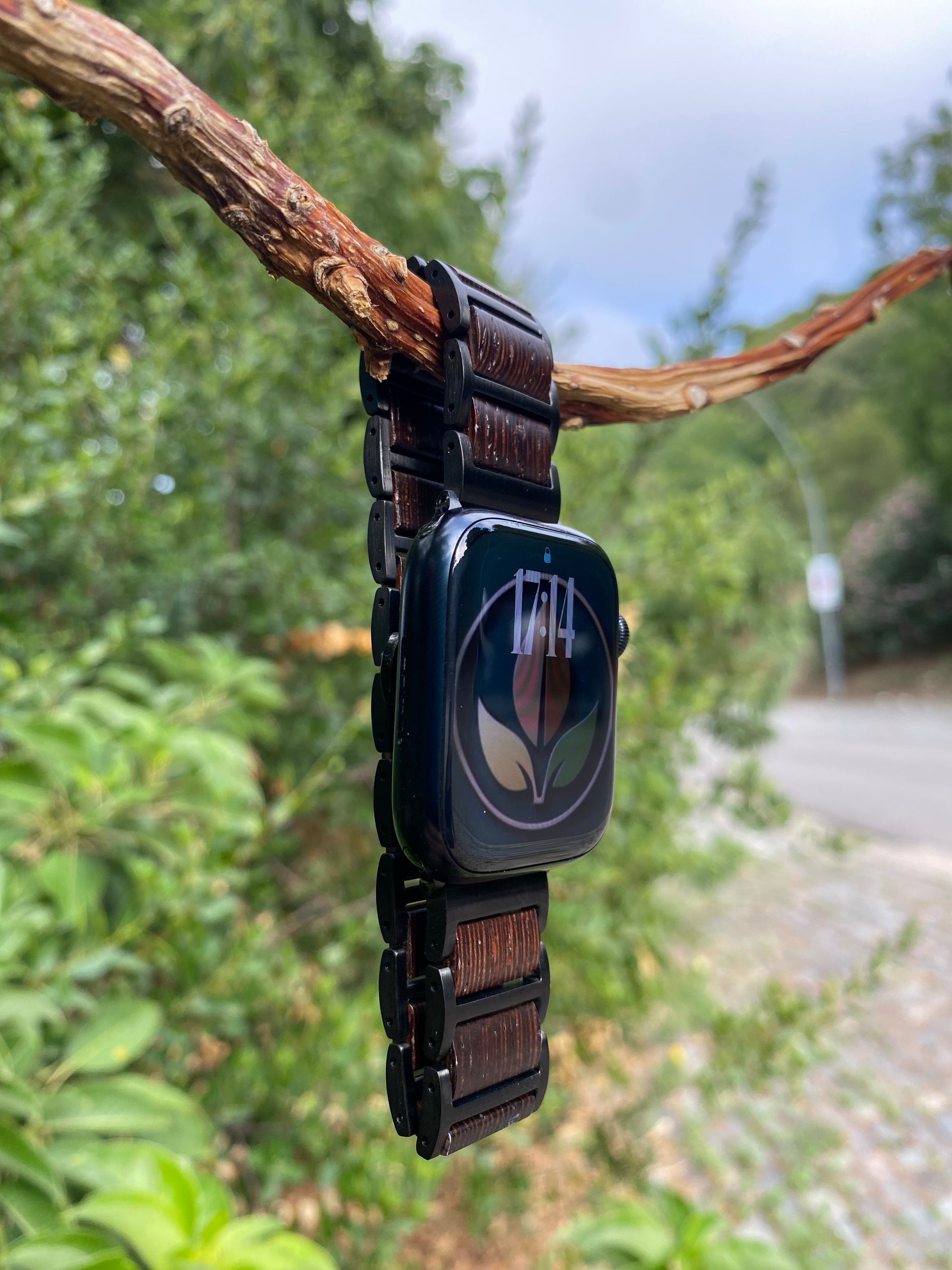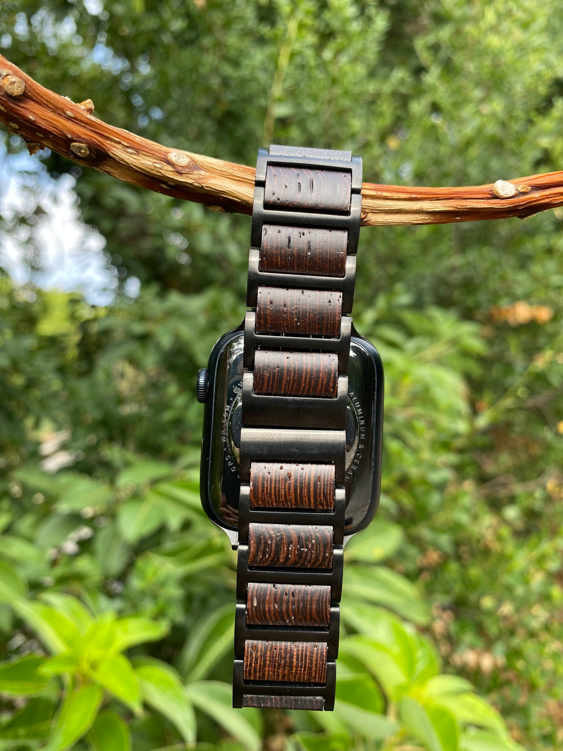 With an elegant and natural design, it is composed of darkened metal links combined with Wenge wood pieces in deep tones, giving it a unique and highly refined style.