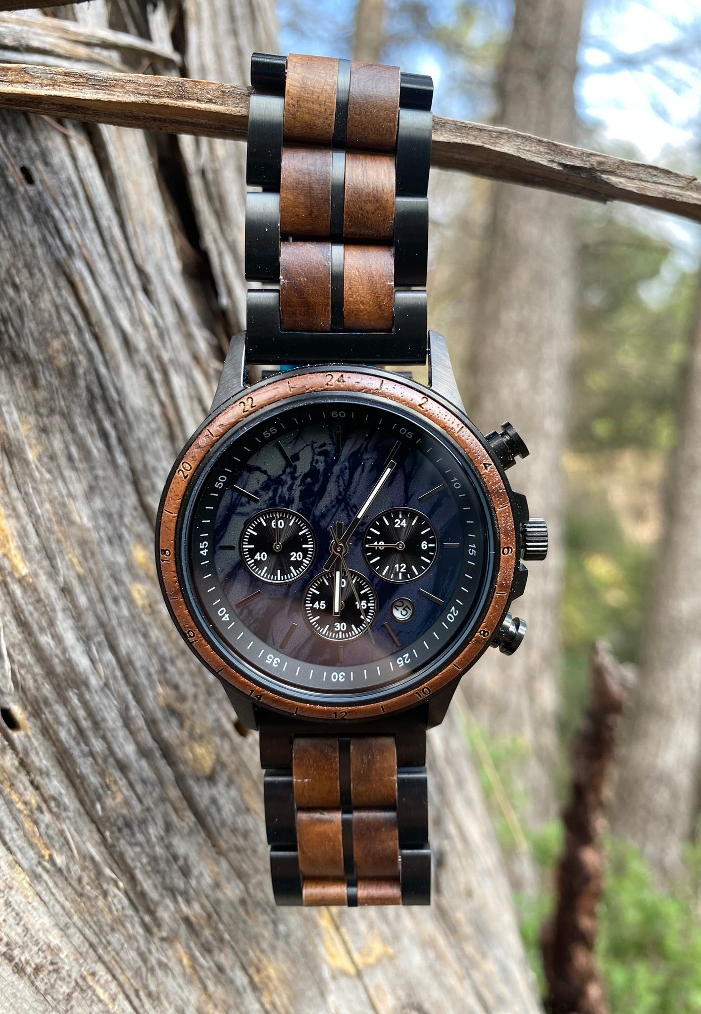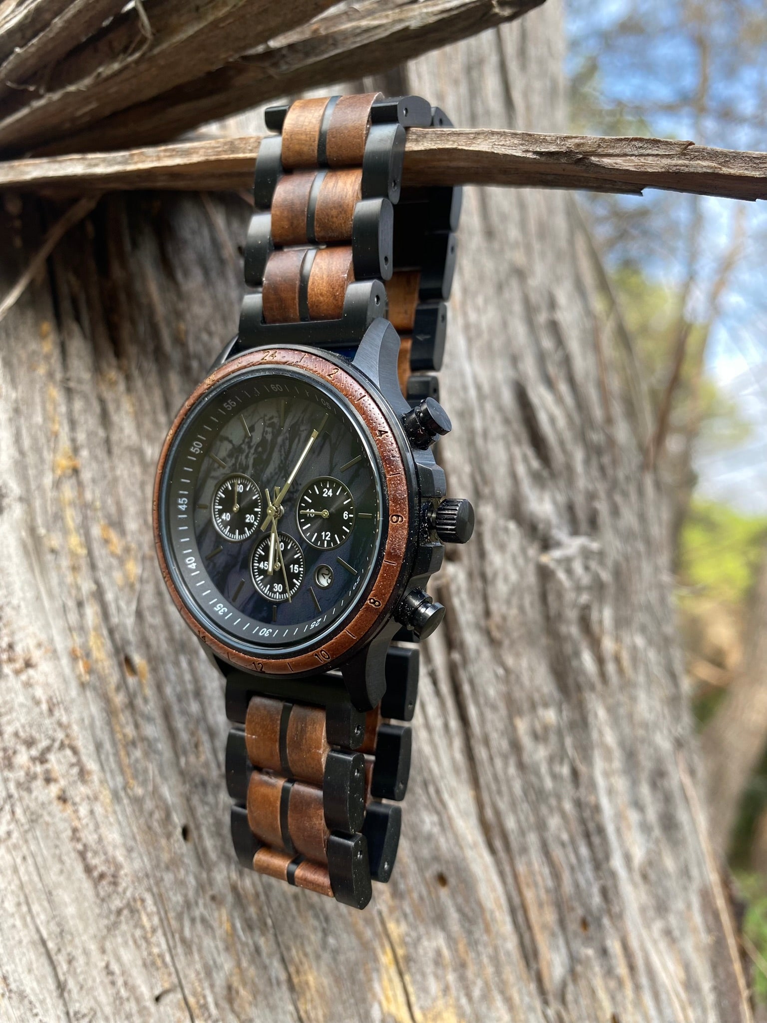 Crafted from premium natural wood, this Time Leaf timepiece embodies elegance and exclusivity. Its refined chronograph design merges timeless sophistication with sustainable craftsmanship, making it the perfect statement piece for those who value both style and distinction.