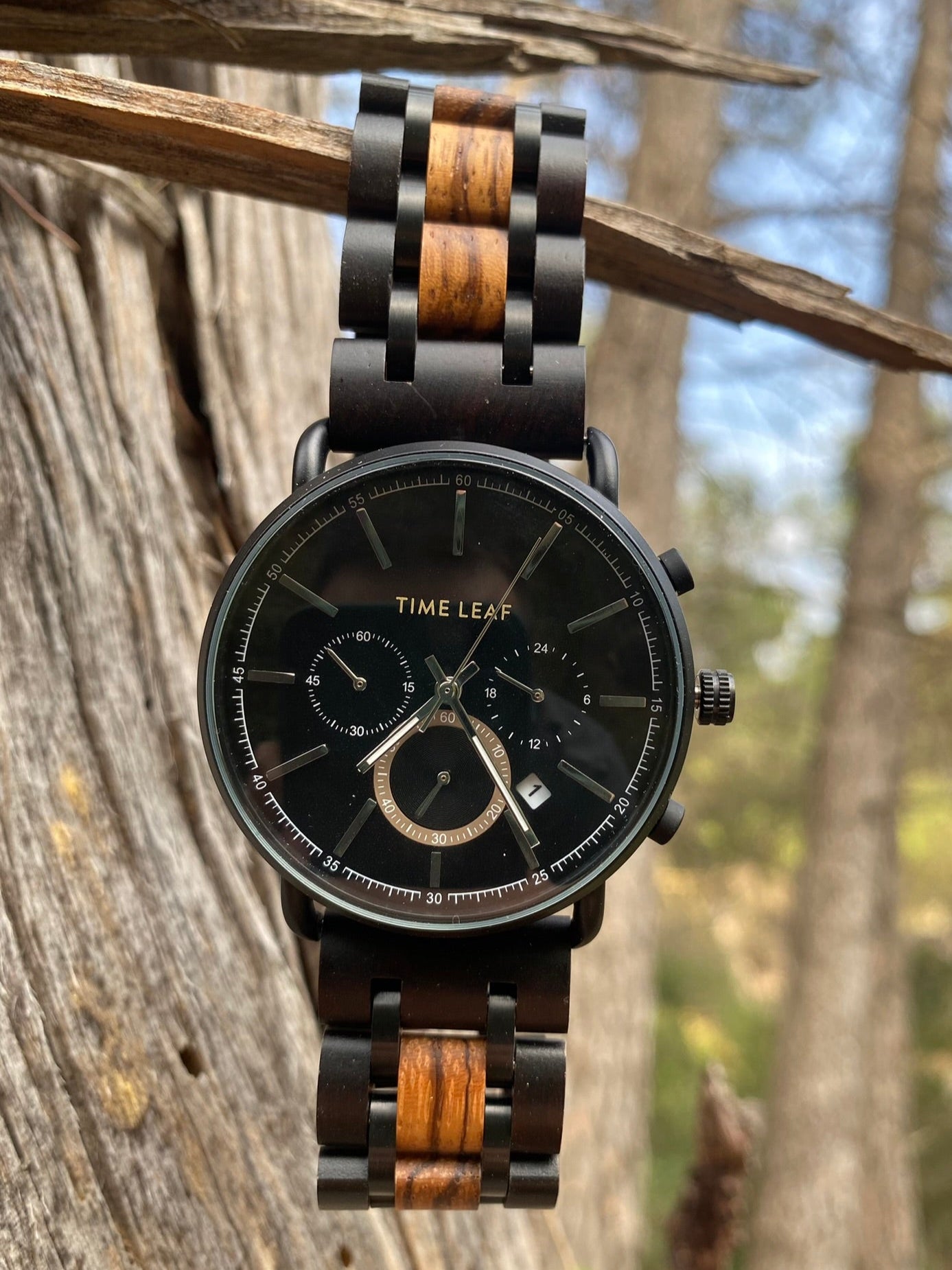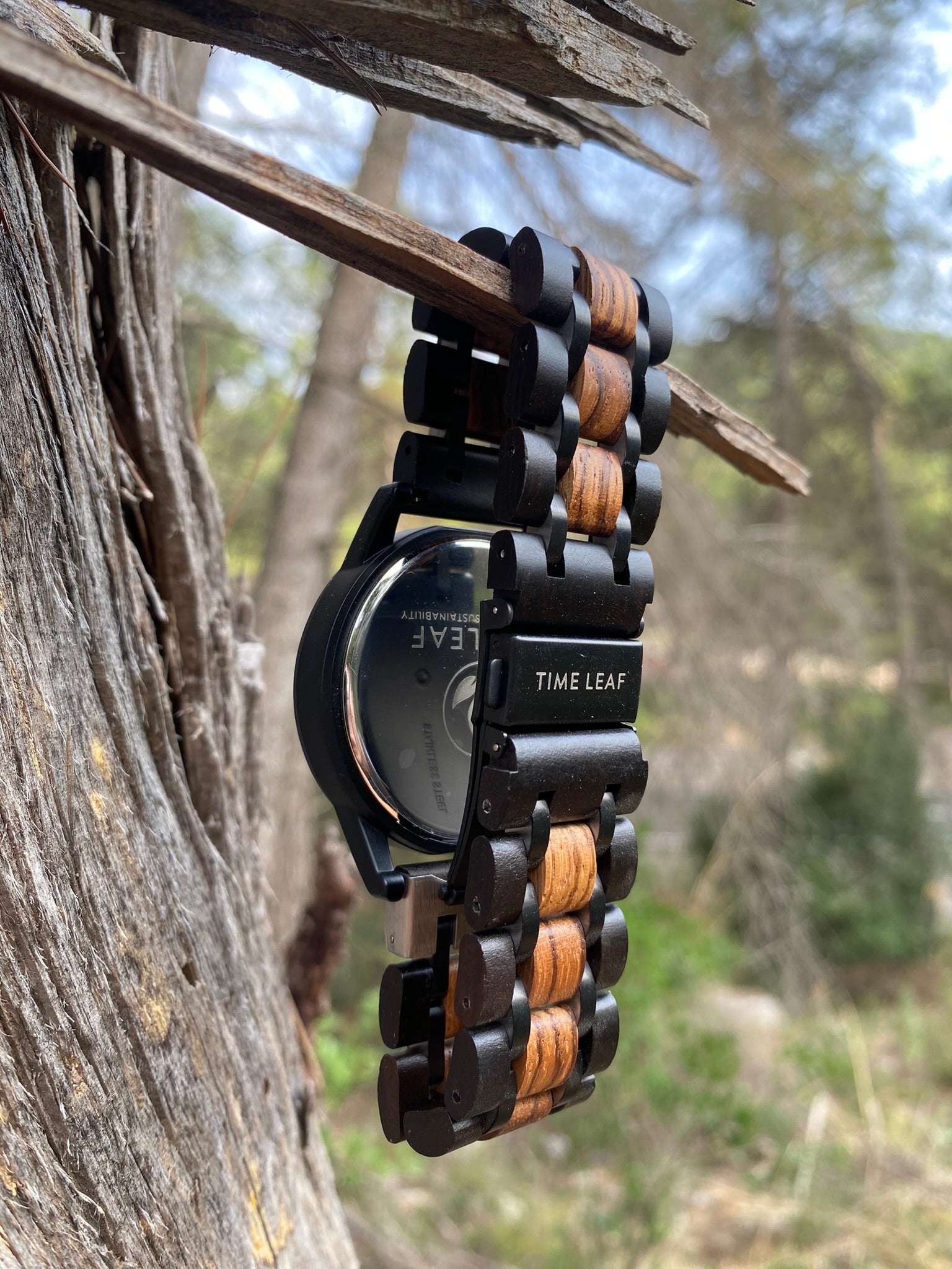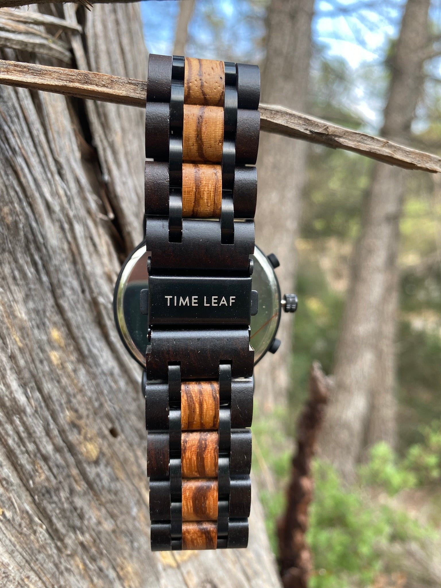 A striking fusion of light oak and deep ebony, this Time Leaf timepiece radiates bold elegance. Accented with refined black dials and a daring red second hand, it embodies power, precision, and the timeless beauty of nature crafted into luxury.