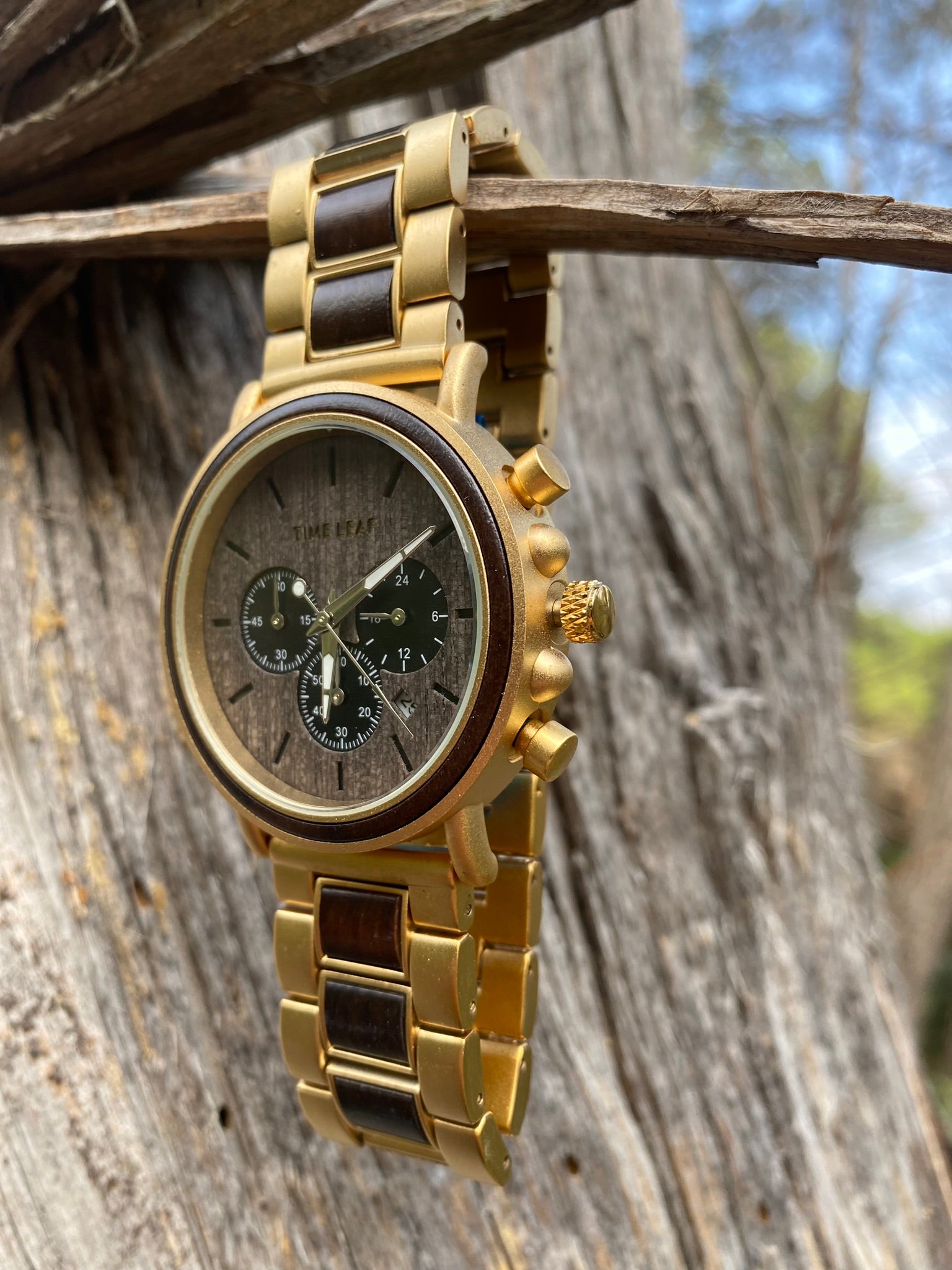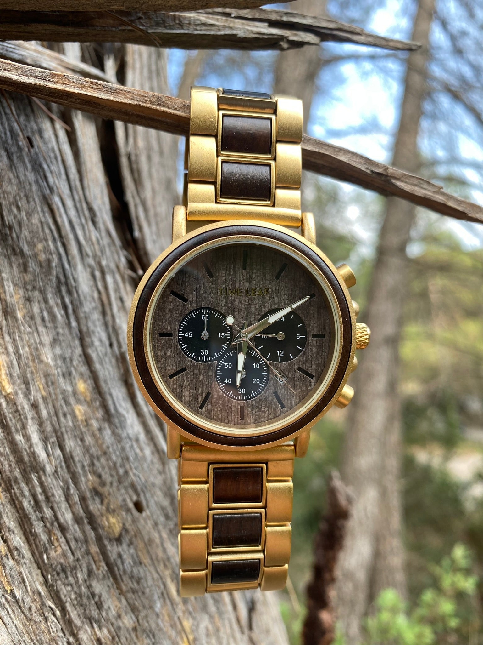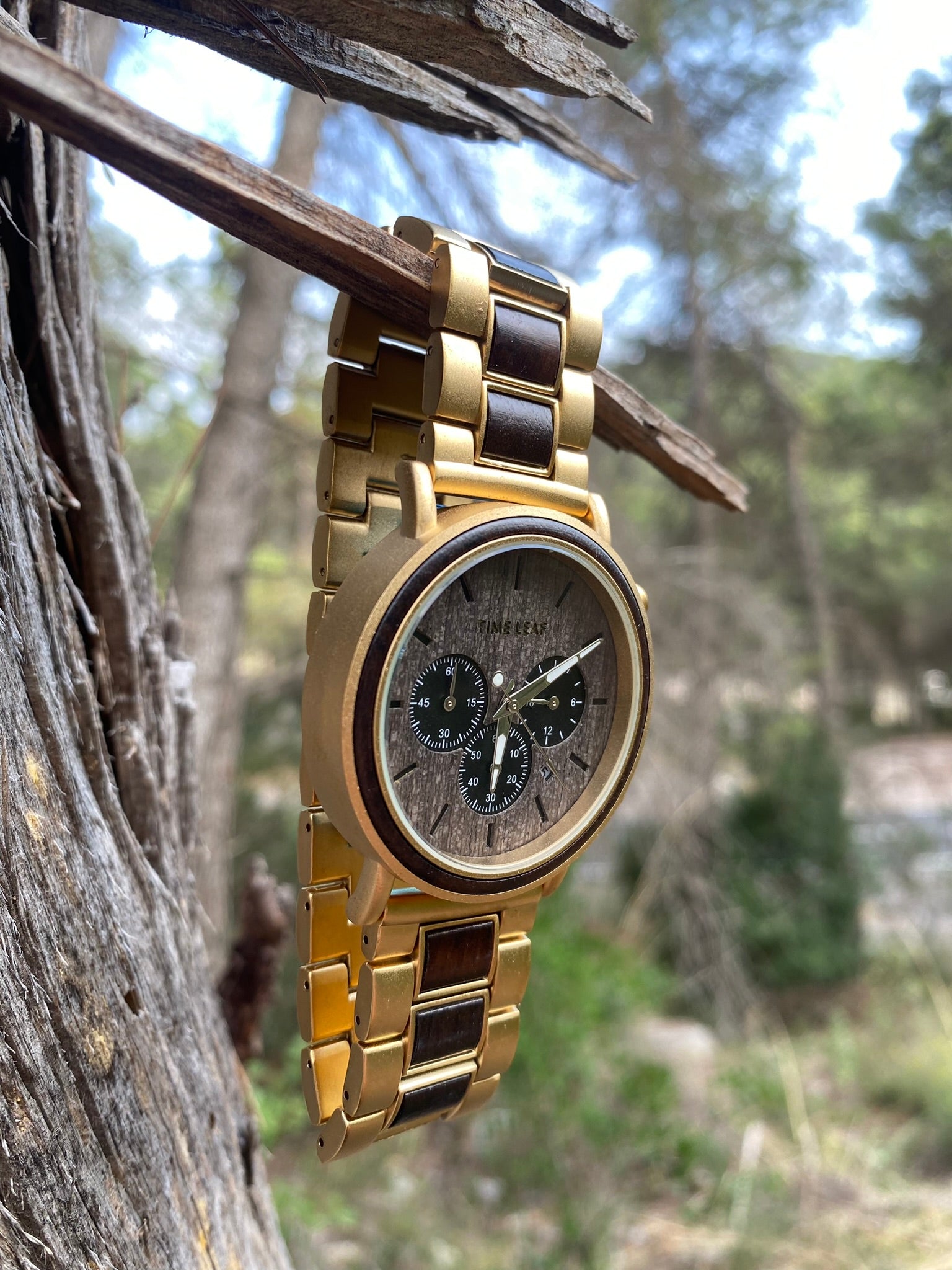 Crafted from premium natural wood, this Time Leaf timepiece embodies elegance and exclusivity. Its refined chronograph design merges timeless sophistication with sustainable craftsmanship, making it the perfect statement piece for those who value both style and distinction.