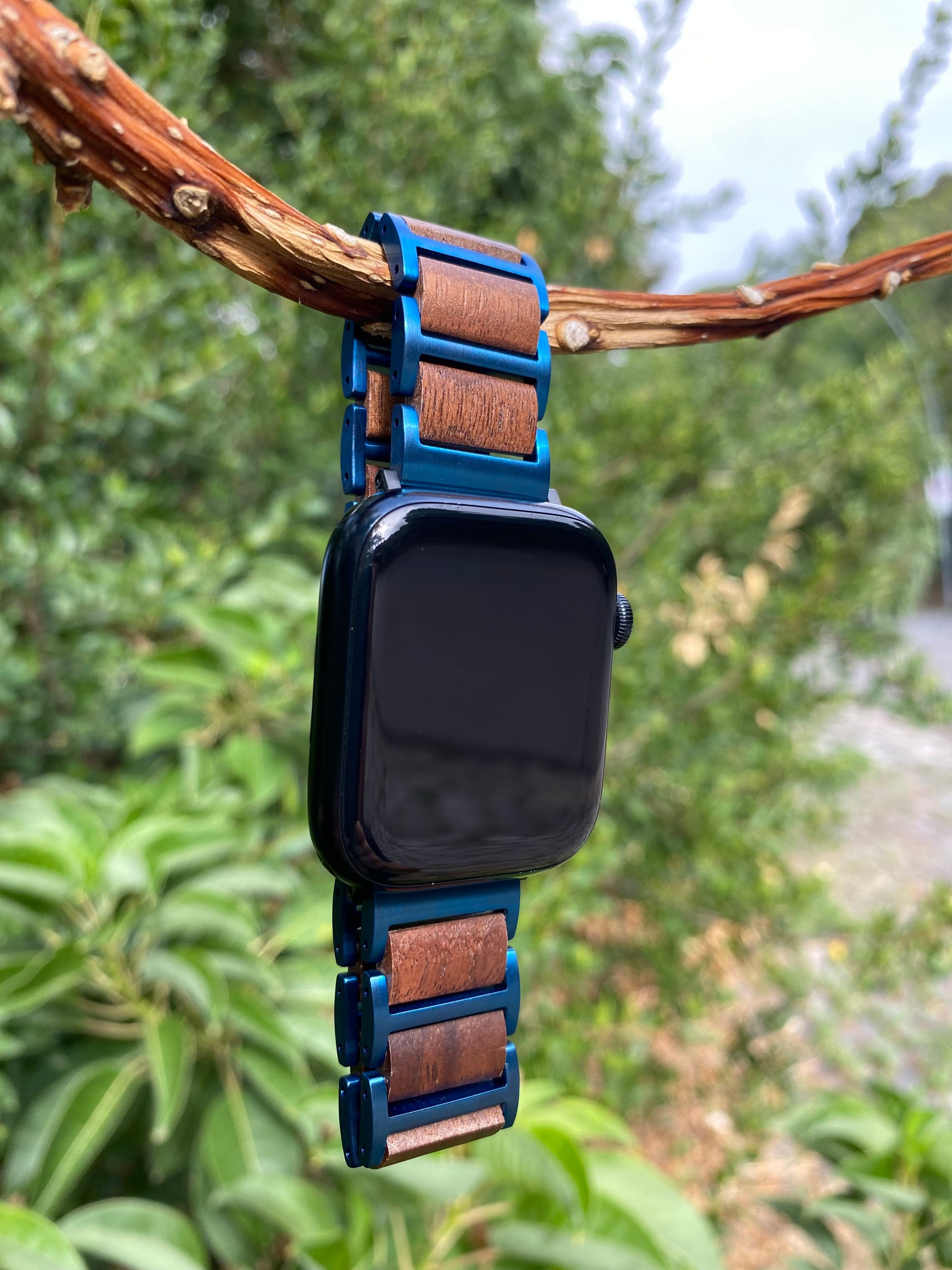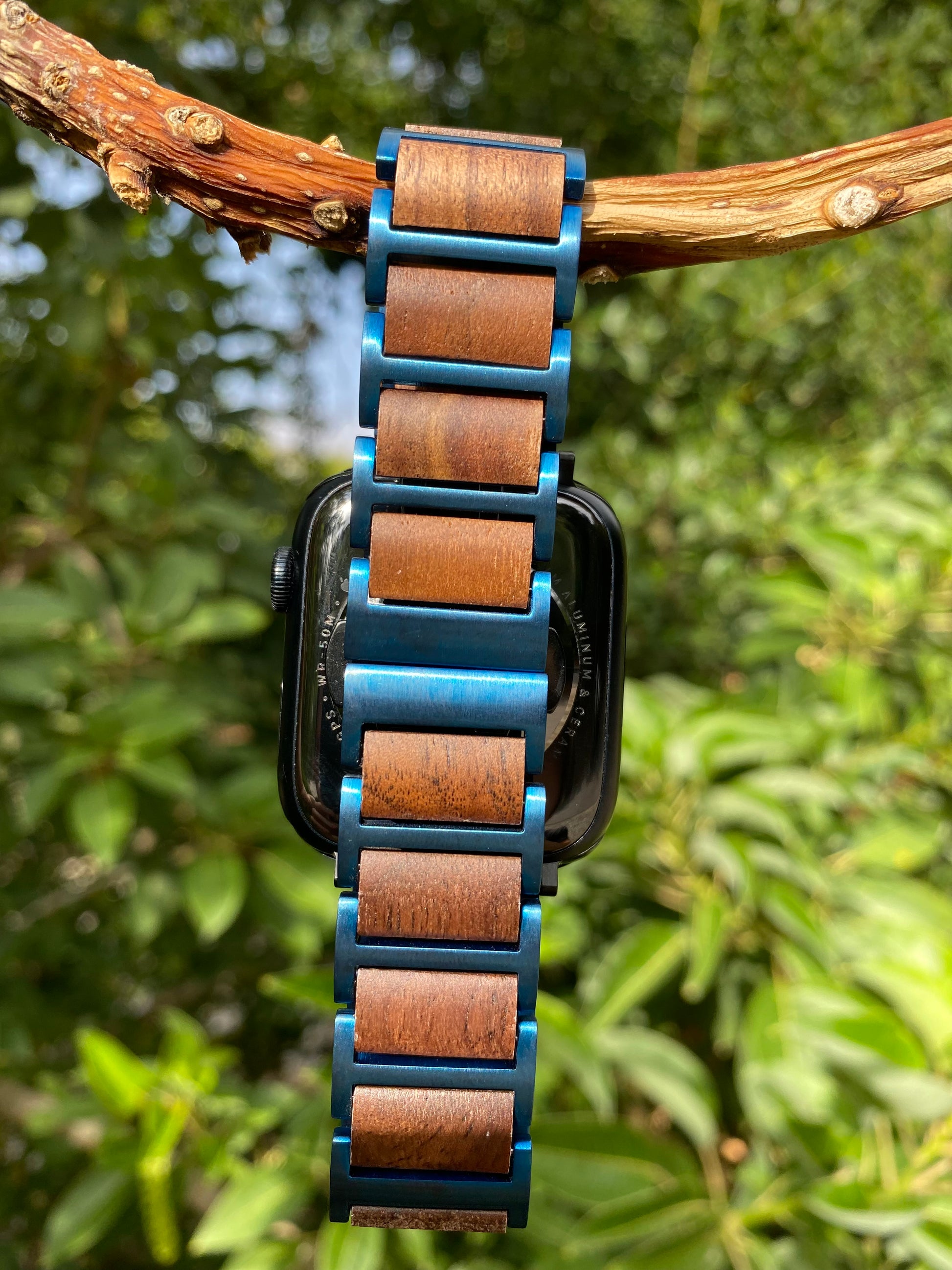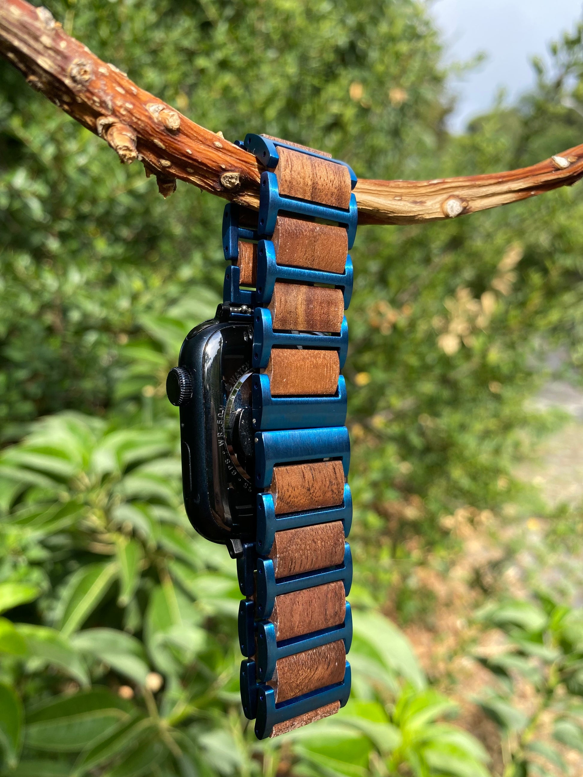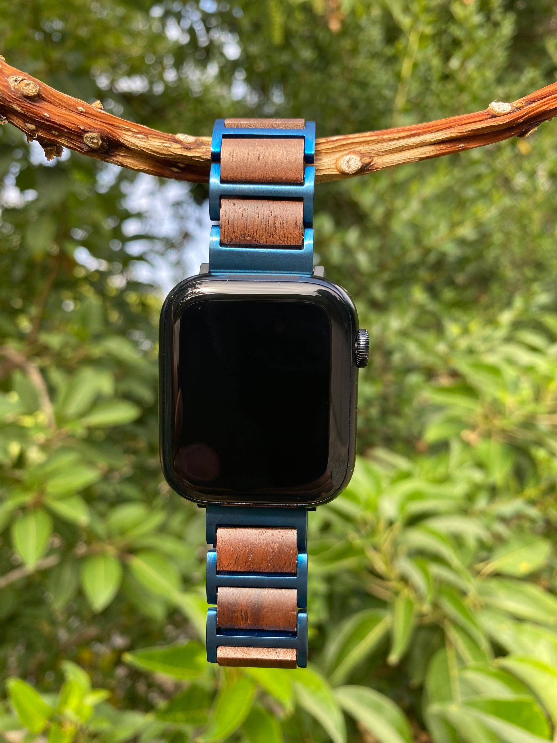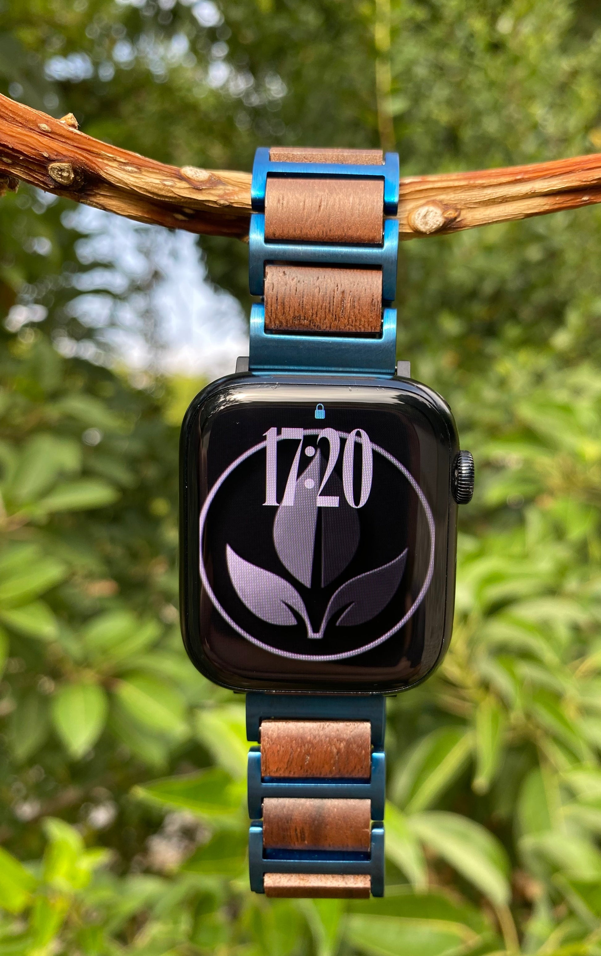 The contrast between the vibrant blue steel and the warm texture of the wood brings freshness, originality, and a unique personality to every wear.