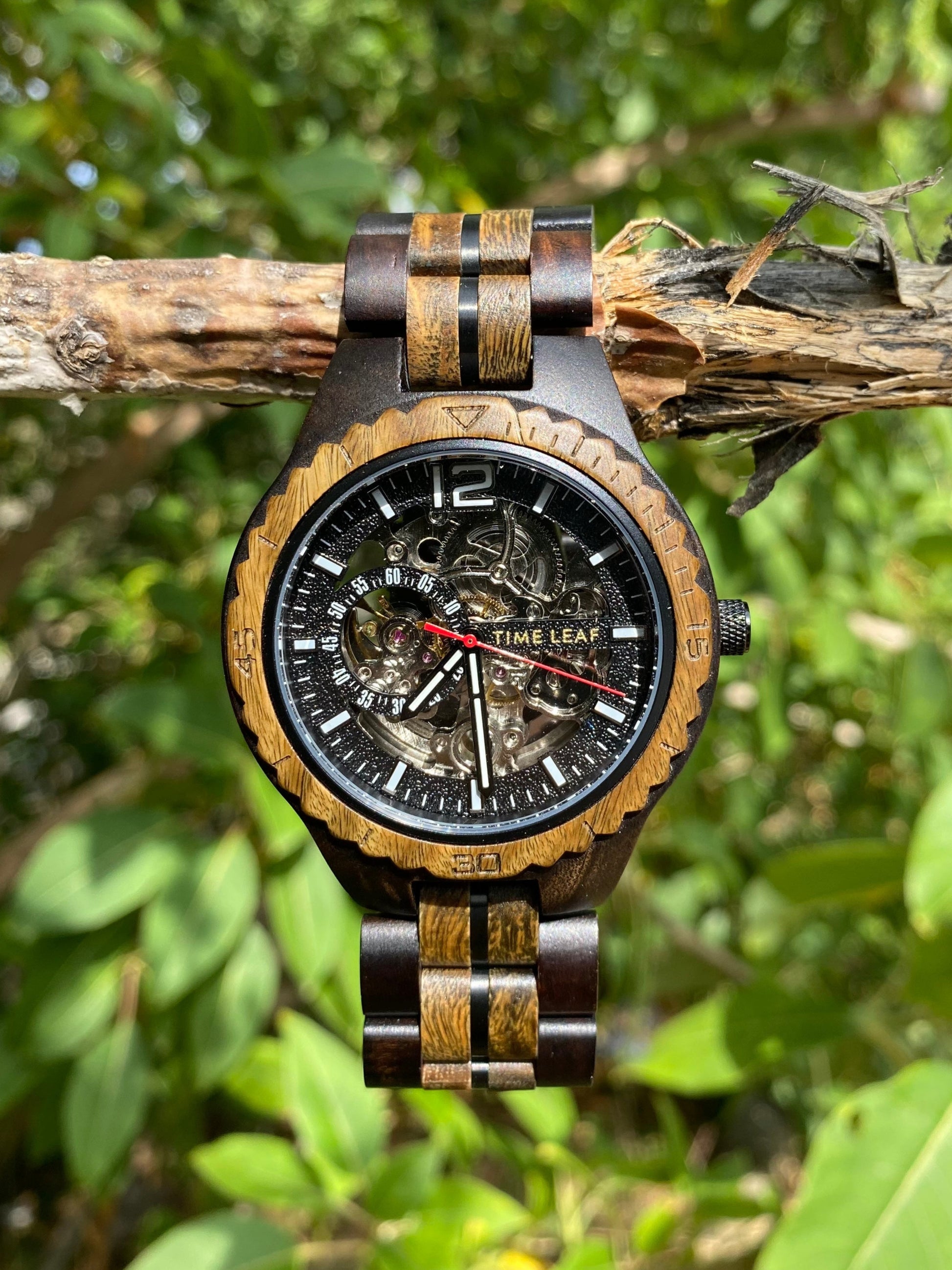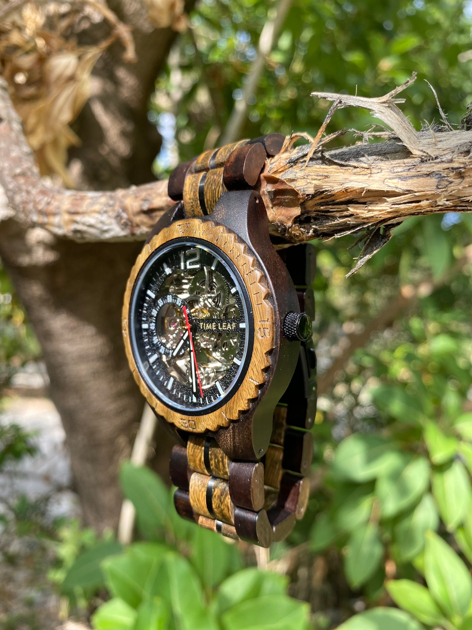 Automatic watch made of natural wood and titanium, combining elegance and durability. Minimalist, handcrafted, and sustainable design, ideal for those seeking style and a connection with nature.