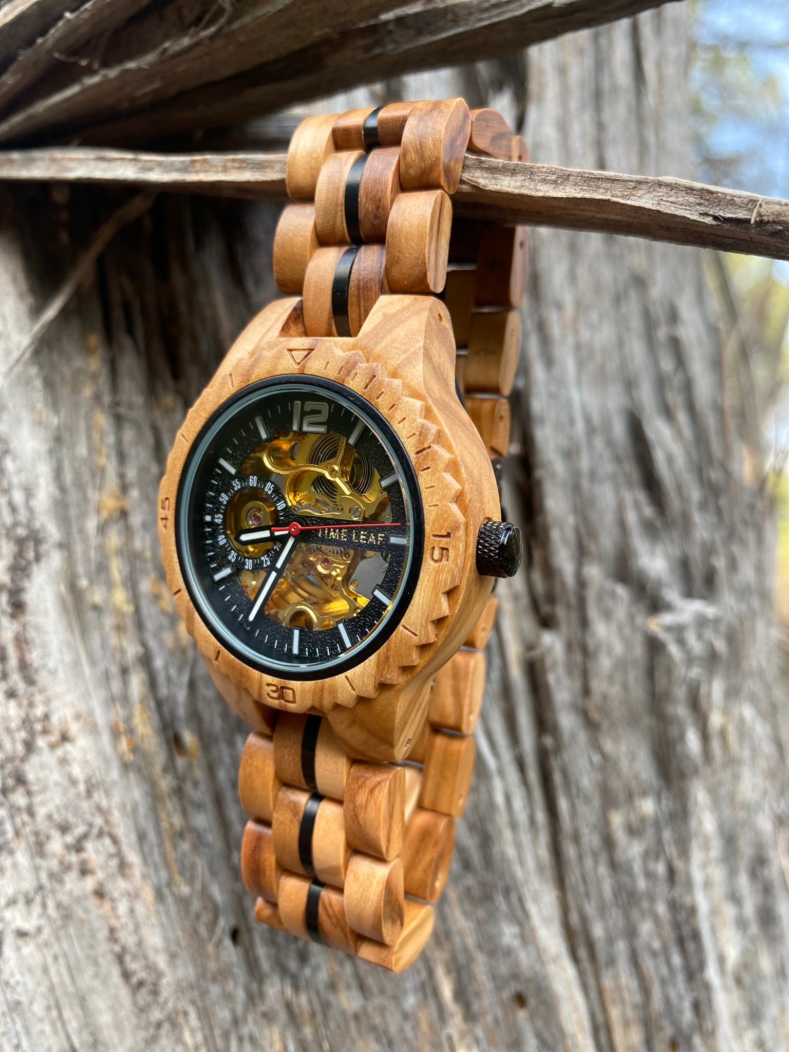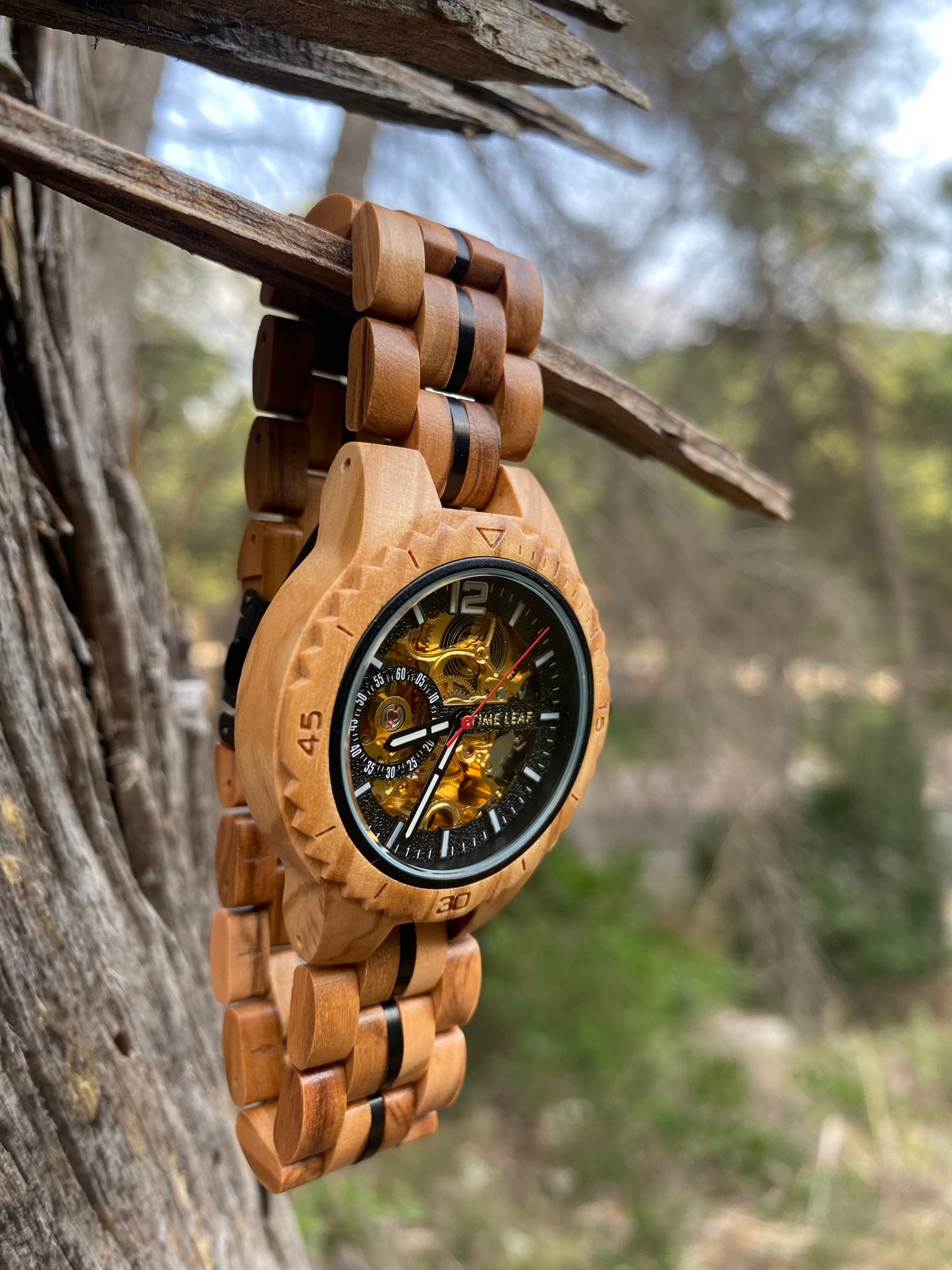 Automatic watch made of natural wood and titanium, combining elegance and durability. Minimalist, handcrafted, and sustainable design, ideal for those seeking style and a connection with nature.